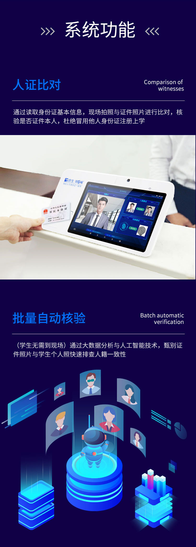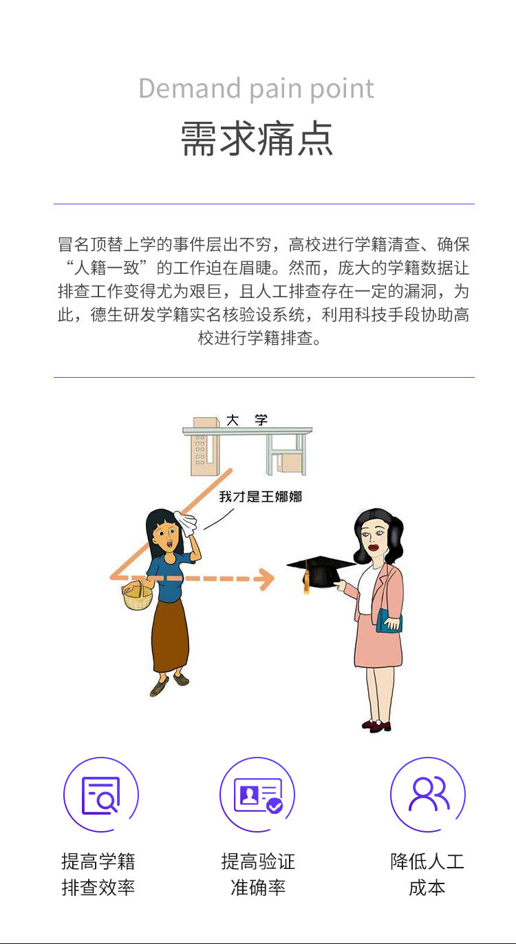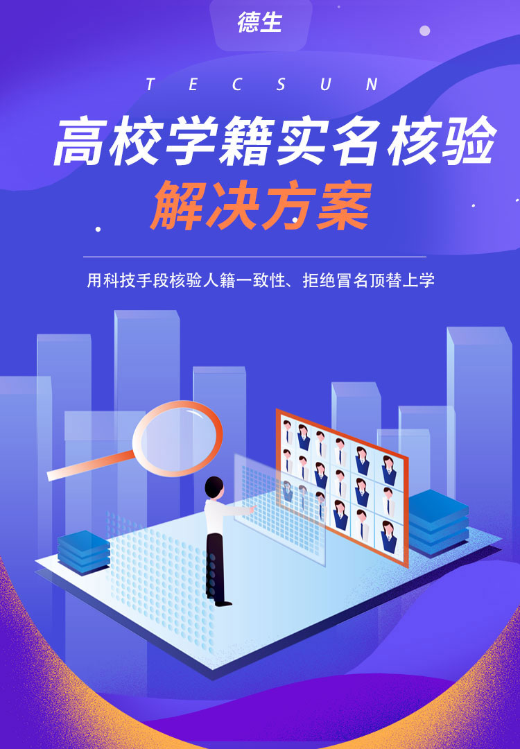 冒名頂替上學(xué)的事情,層出不窮,高校進(jìn)行學(xué)籍清查、確保人、證、學(xué)籍一致的工作迫在眉睫。然而,龐大的數(shù)據(jù)讓排查工作變得尤為艱巨,且讓人工排查存在一定的漏洞,為此,德生推出人證合一的學(xué)籍實(shí)名核驗(yàn)系統(tǒng),讀取身份證基本信息,現(xiàn)場(chǎng)拍照與身份證上的照片、學(xué)籍照片、學(xué)籍信息進(jìn)行比對(duì),進(jìn)行人、身份證、學(xué)籍的三方比對(duì),杜絕冒用他人身份證注冊(cè)上學(xué)!
