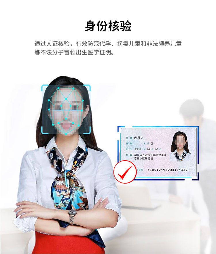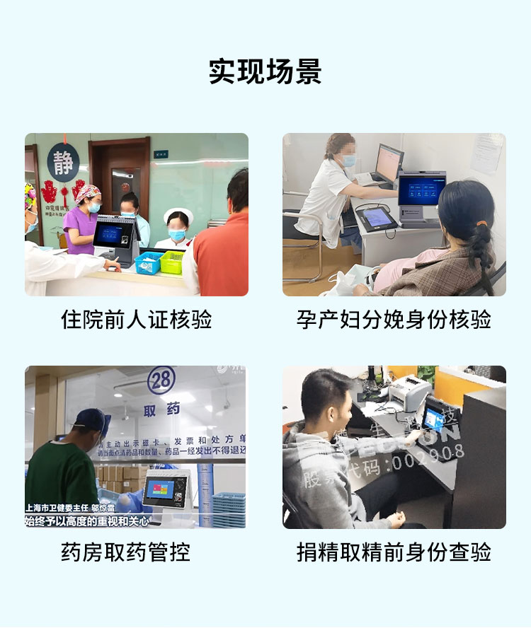 集身份證閱讀、指紋比對(duì)、人臉識(shí)別功能于一體,核驗(yàn)人與身份證的一致性。 適用于醫(yī)院孕產(chǎn)婦住院分娩、出生醫(yī)學(xué)證明簽發(fā)窗口、捐精取精前等醫(yī)學(xué)檢查和身份查驗(yàn)場(chǎng)景。